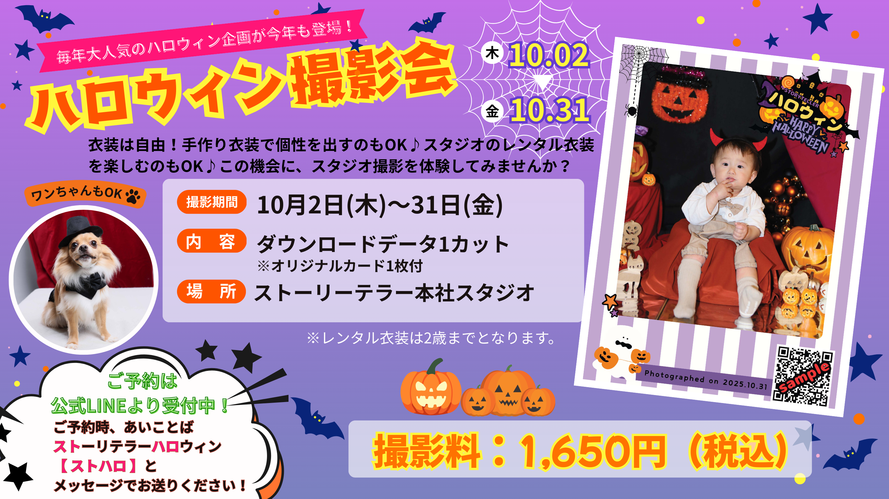 【 🎃ハロウィン撮影会🎃】 10月2日(木)〜10月31日(金)ベビー・キッズ&わんちゃん参加OK!撮影料:1,650円(税込)※ベビーフォトフリーパスの方は無料★1ポーズ撮影+1カットデータ付き仮装自由!レンタル衣装も