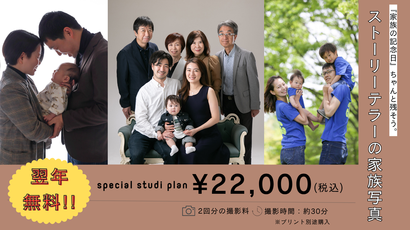 ファミリーフォト2年パック 家族がそろうこの季節に、未来のアルバムに残る一枚を。 家族が集まるその時間は、思っているよりずっと特別。何気ない笑顔やふとした仕草も、写真に残すことで “かけがえのない今”になります。 初回2